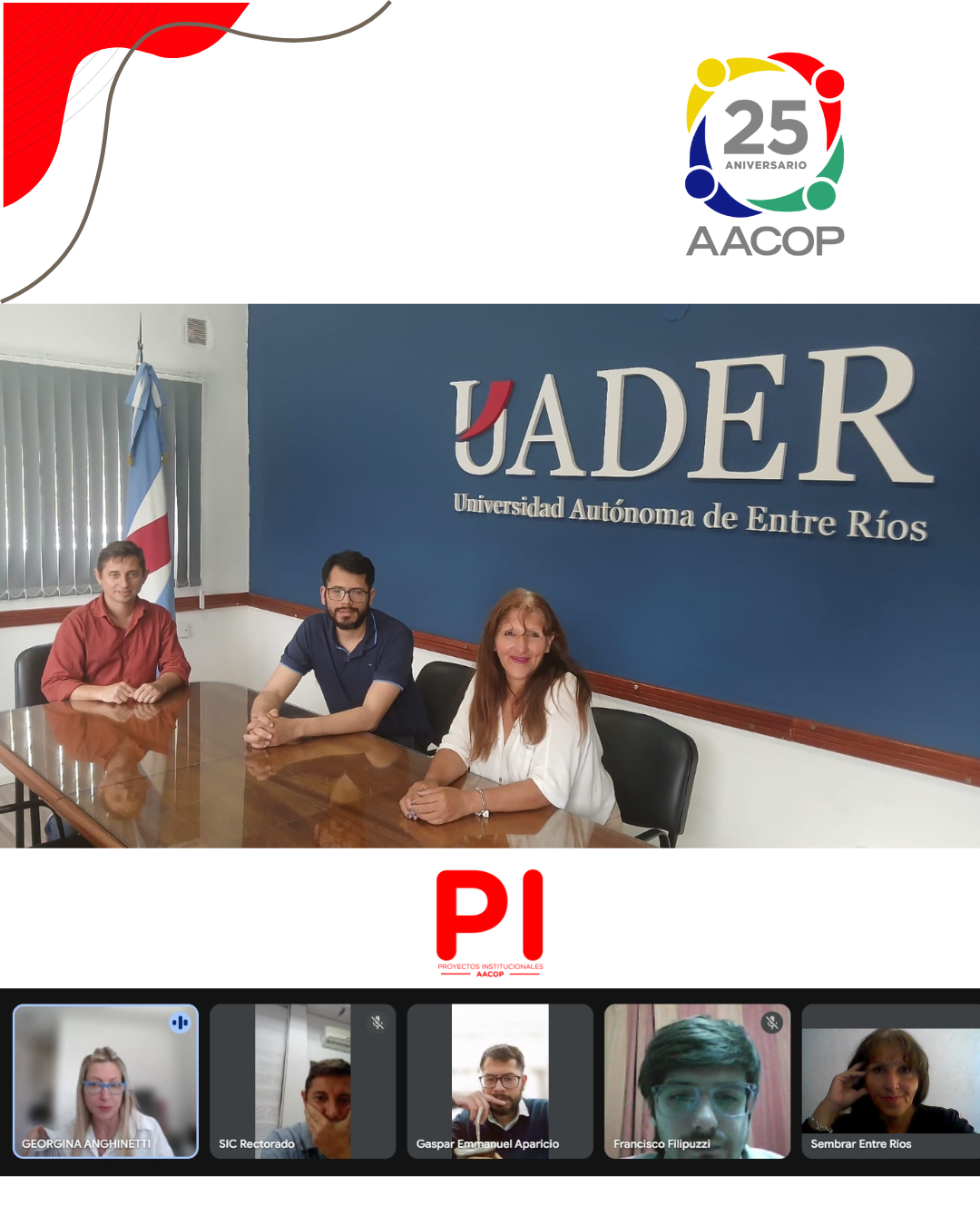Se mantuvieron reuniones de acercamiento y planificación conjunta entre la referente del proyecto por PI: Claudia Diaz y los señores Raúl Rousseaux, Secretario de integración y Cooperación, Gaspar Aparicio, secretario económico financiero y Francisco Filipuzzi, representantes de la Secretaría Económica de dicha casa de estudios. Estos encuentros permitieron revisar los acuerdos previos, actualizar las líneas de trabajo y proyectar nuevas acciones colaborativas orientadas a fortalecer la formación, el desarrollo institucional y la vinculación entre la universidad y AACOP.